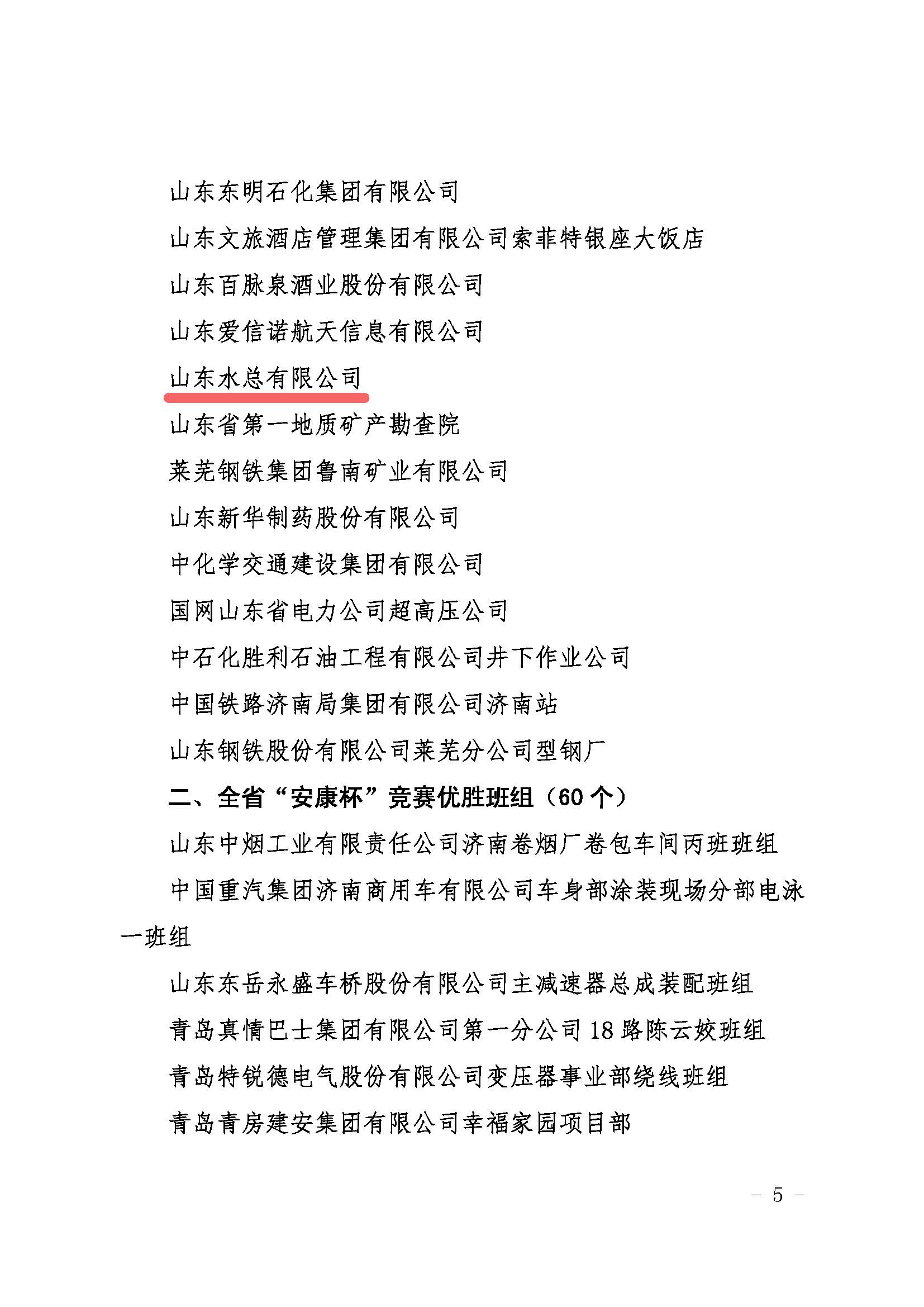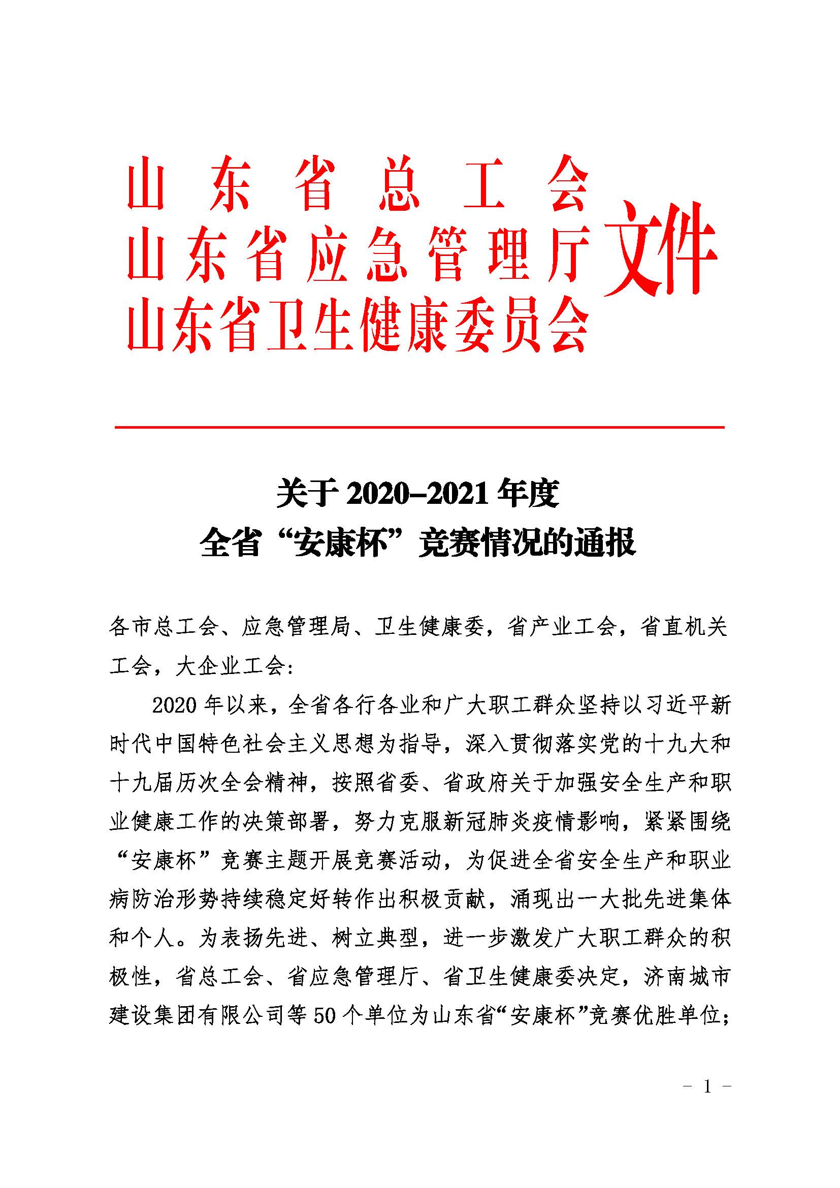 公司荣获2020-2021年度山东省“安康杯”竞赛优胜单位称号
