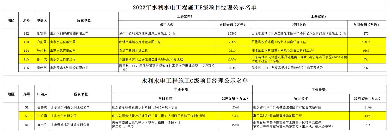 近日,中国水利企业协会发布《2022年水利水电工程施工项目经理评价等级公示》,我公司卢正雷、马化振、张斌三名同志被评为“2022年水利水电工程施工B级项目经理”,李广喜被评为“2022年水利水电工程施工C级项目经理”。