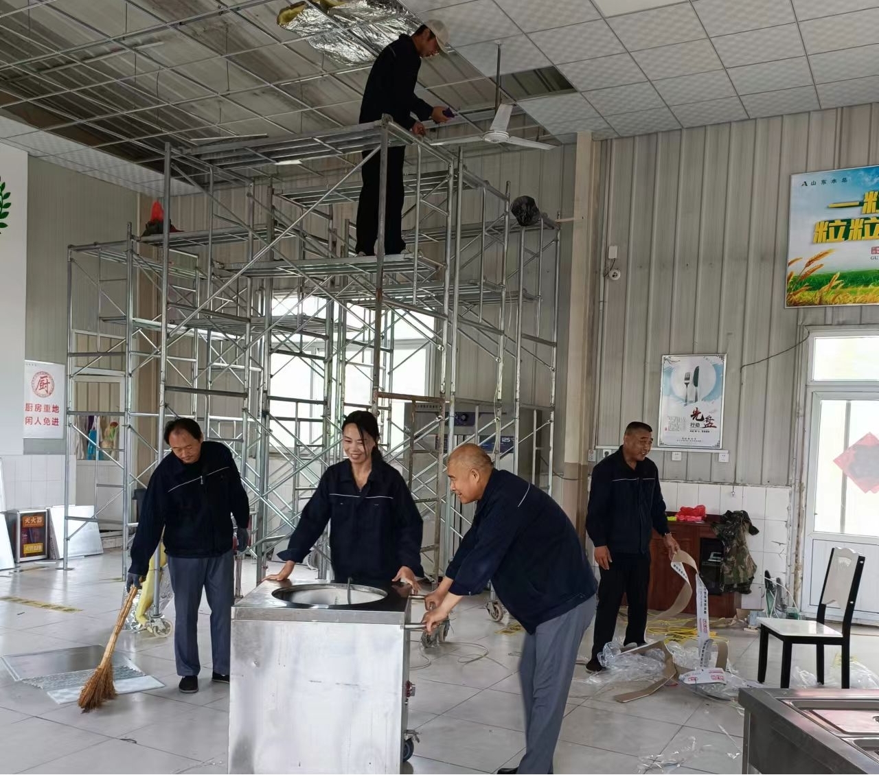 在施工现场,劳务公司党员干部带领员工及外聘人员对食堂进行吊顶装饰,安装吊筋、龙骨、面板,穿管线布线等。曲阜基地食堂屋顶原是彩钢瓦单层装配结构,冬不保暖、夏不隔热,有些部位已经腐蚀生锈,甚至弯曲变形。本次餐厅升级用轻钢龙骨和硅钙板加岩棉吊顶,用木质龙骨和pvs板装饰灶房,既达到隔热保温效果,又最大程度节约了成本,解决了夏天酷热、冬天寒冷的就餐问题。